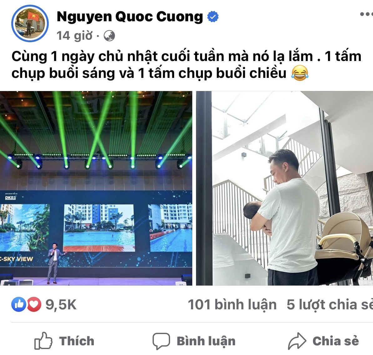 Mới đây, trên trang cá nhân Cường Đô La đăng tải khoảnh khắc vào hai vai. Anh hài hước viết: "Cùng một ngày mà nó lạ lắm, một tấm chụp sáng và một tấm chụp chiều". Cụ thể, ông xã Đàm Thu Trang so sánh hình ảnh của chính mình lúc đi làm và ở nhà, công nhận khác nhau đến lạ.