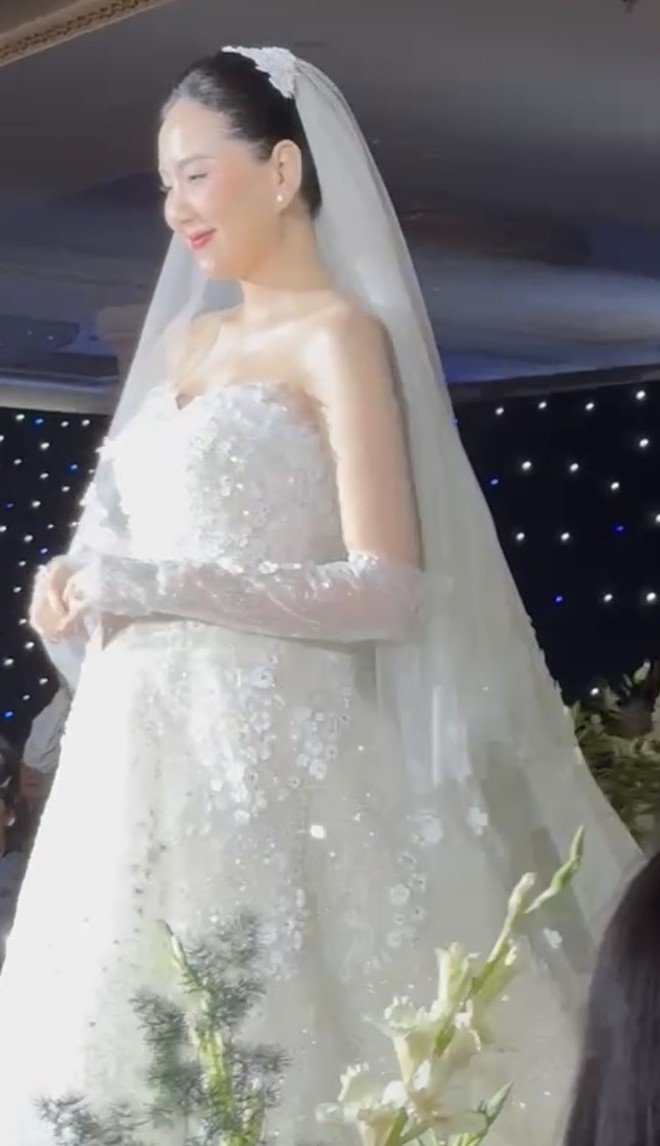Trong những hình ảnh hiếm hoi từ đám cưới của Mai Ngọc , người đẹp diện váy cưới cúp ngực đính kết lộng lẫy. Mai Ngọc búi tóc, trang điểm nhẹ nhàng làm nổi bật vẻ đẹp thanh lịch, sang trọng. Không gian tiệc cưới của Mai Ngọc được trang trí bằng hoa tươi tông màu trắng sang trọng.