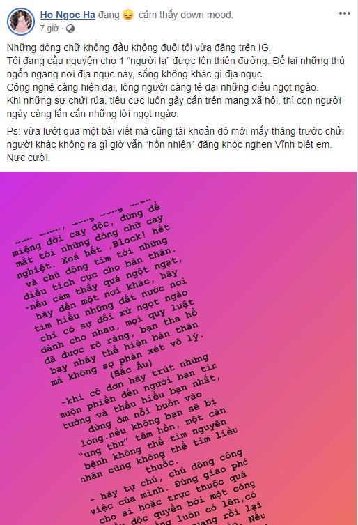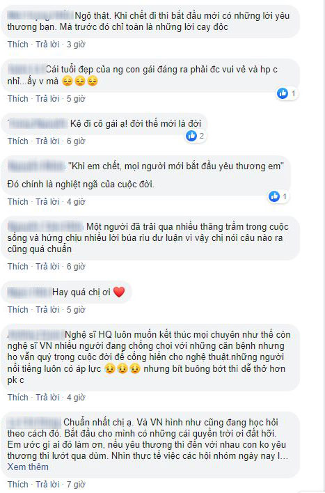 Chia sẻ story này lên facebook, giọng ca "Cả một trời thương nhớ" còn thể hiện sự bức xúc với chủ nhân của một tài khoản mà mới cách đây ít tháng thôi vừa chửi rủa người khác không ra gì nhưng giờ lại khóc nghẹn để vĩnh biệt người quá cố: "Những dòng chữ không đầu không đuôi tôi vừa đăng trên IG. Tôi đang cầu nguyện cho một “người lạ” được lên thiên đường. Để lại những thứ ngổn ngang nơi địa ngục này, sống không khác gì địa ngục. Công nghệ càng hiện đại, lòng người càng tê dại những điều ngọt ngào. Khi những sự chửi rủa, tiêu cực luôn gây cấn trên mạng xã hội, thì con người ngày càng lấn cấn những lời ngọt ngào.