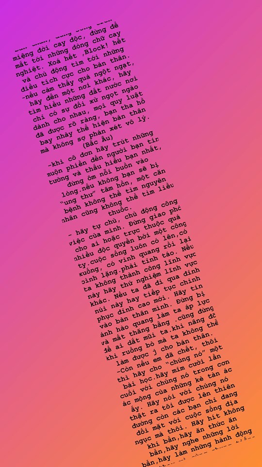 Nếu em đã chết, thôi thì hãy cho "chúng nó" một bài học. Hãy mỉm cười lần cuối với chúng nó trong cơn ác mộng của những kẻ tàn ác ấy. Hãy nói với chúng nó thật ra tôi được lên thiên đường còn các bạn chỉ đang đối mặt với cuộc sống địa ngục mà thôi...".