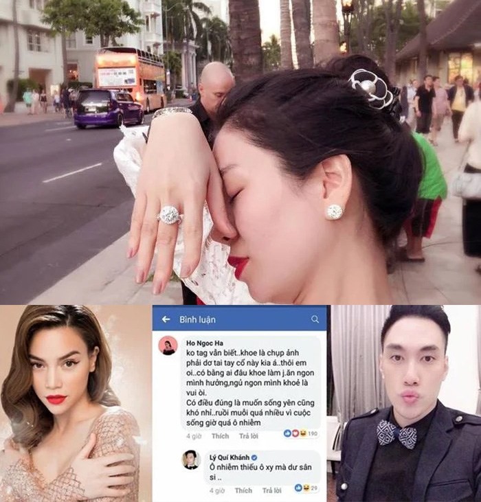 Cụ thể, giữa năm 2018, Lệ Quyên đăng ảnh "khoe" nhẫn kim cương ở trời Tây. Câu chuyện sẽ không có gì đáng bàn nếu như dân mạng không "soi" được một bình luận của Hồ Ngọc Hà trên trang cá nhân của NTK Lý Quí Khánh: "Không tag vẫn biết... Khoe là chụp ảnh phải giơ tai tay cổ này kia á... Thôi em ơi... Có bằng ai đâu khoe làm gì. Ăn ngon mình hưởng, ngủ ngon mình khỏe là vui rồi. Có điều đúng là muốn sống yên cũng khó nhỉ... Ruồi muỗi quá nhiều vì cuộc sống quá ô nhiễm".