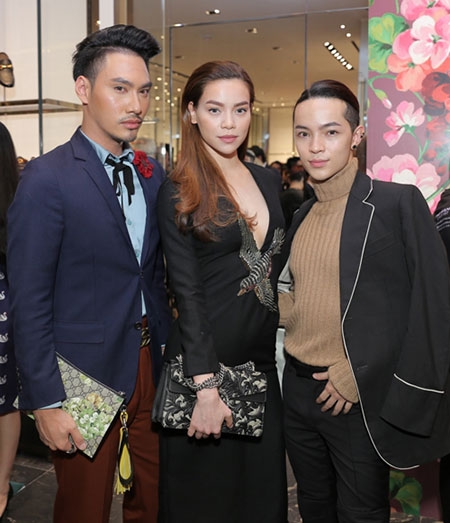 Nhà thiết kế Lý Quí Khánh, Hồ Ngọc Hà và Kelbin Lei trong buổi giới thiệu cửa hàng của một thương hiệu thời trang nổi tiếng thế giới lần đầu xuất hiện ở TP HCM. |