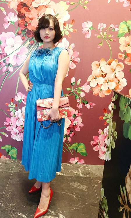 Diễn viên Đỗ Hải Yến chọn màu nổi với váy xanh, túi xách và giày cao gót trên tông đỏ đậm để góp mặt trong buổi tiệc. |