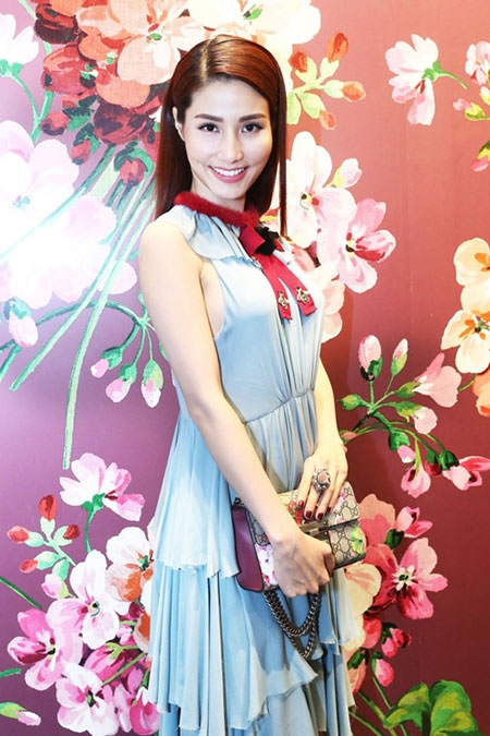 Diễm My 9x thanh lịch với váy xếp tầng gam xanh pastel nhẹ nhàng. |