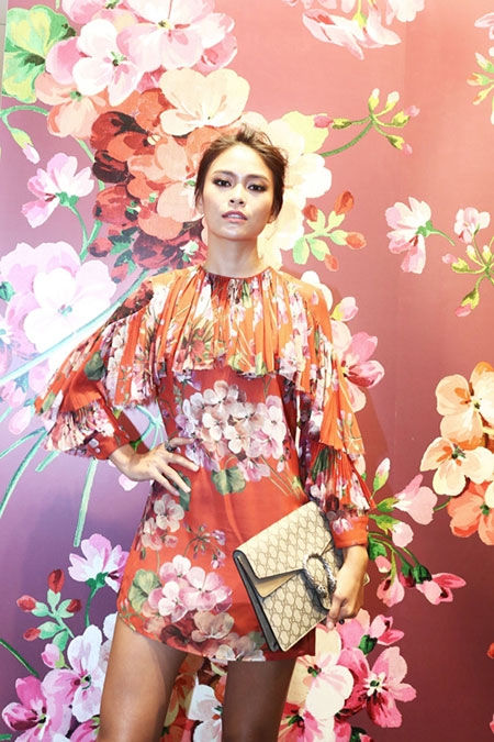 Mâu Thanh Thủy khoe chân dài với váy ngắn in họa tiết cánh hoa rực rỡ sắc hồng, cam. |
