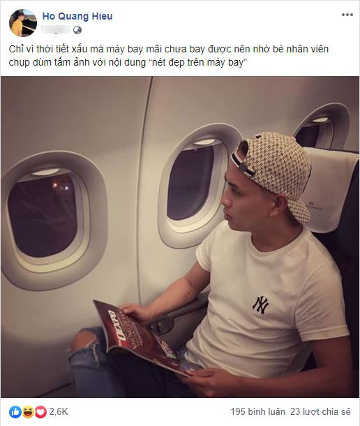 Mới đây, Hồ Quang Hiếu đã đăng tải một bức ảnh "so deep" trên máy bay với dòng chú thích vừa hài hước, vừa tưng tửng giống như anh vẫn thường vậy: "Chỉ vì thời tiết xấu mà máy bay mãi chưa bay được nên nhờ bé nhân viên chụp dùm tấm ảnh với nội dung “nét đẹp trên máy bay”".