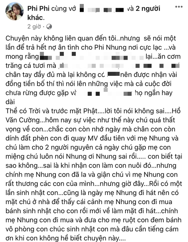 Cũng vừa mới đây, chuyên gia trang điểm Phi Phi - một người em, người đồng nghiệp với cố ca sĩ có dòng trạng thái dài, bày tỏ sự thất vọng với cách hành xử của Hồ Văn Cường khi được cựu người mẫu hỏi về sự việc. Người này cho biết dù sự việc không liên quan đến anh nhưng cũng sẽ nói ra hết để trả nợ ân tình cho Phi Nhung, và đặc biệt để tránh những lời lẽ không hay của một bộ phận cộng đồng mạng trước sự ra đi của người quá cố.