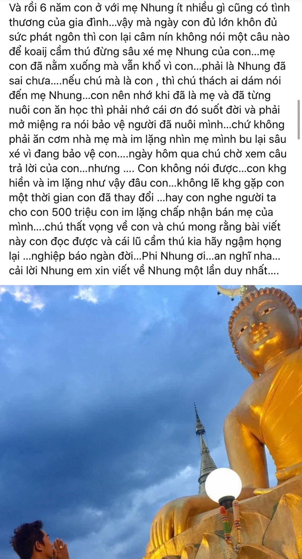 Trên trang cá nhân của mình, chuyên gia trang điểm này tỏ thái độ bức xúc thấy rõ: "Và rồi 6 năm con ở với mẹ Nhung ít nhiều gì cũng có tình thương của gia đình, vậy mà ngày con đủ lớn khôn, đủ sức phát ngôn thì con lại câm nín không nói một câu nào để kẻ khác sâu xé mẹ Nhung của con.