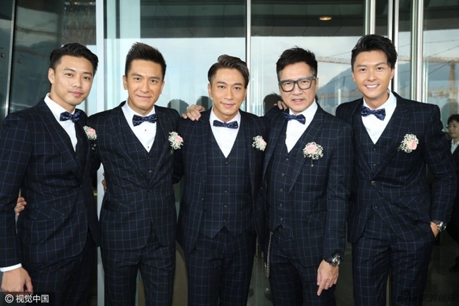| Dàn phù rể tháp tùng trong lễ rước dâu sáng nay có những gương mặt quen thuộc dưới trướng TVB như Mã Quốc Minh, Ngô Trác Hy. |