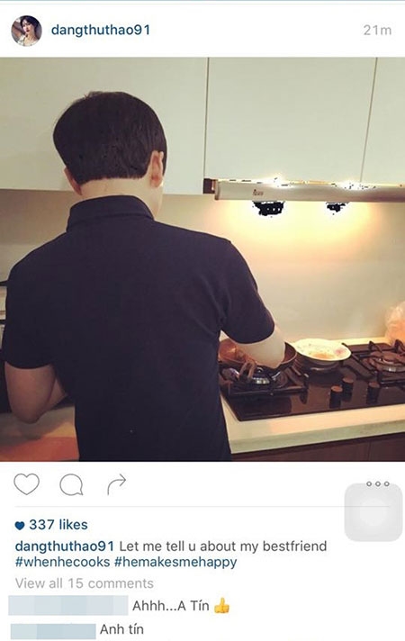 Hoa hậu Đặng Thu Thảo hạnh phúc chia sẻ hình ảnh được bạn trai nấu ăn cho. Dù chỉ là hình chụp phía sau nhưng nhiều người có thể nhận ra đây chính là Trung Tín. Kèm hình ảnh này, Đặng Thu Thảo gọi Trung Tín là người bạn tốt nhất: "Let me tell you about my bestfriend" (Tạm dịch: Hãy để tôi nói với bạn về người bạn tốt nhất của tôi). Trong hình, bạn trai Hoa hậu Đặng Thu Thảo cặm cụi nấu ăn. Dù là doanh nhân thành đạt nhưng Trung Tín tỏ ra rất khéo léo trong việc làm bếp.