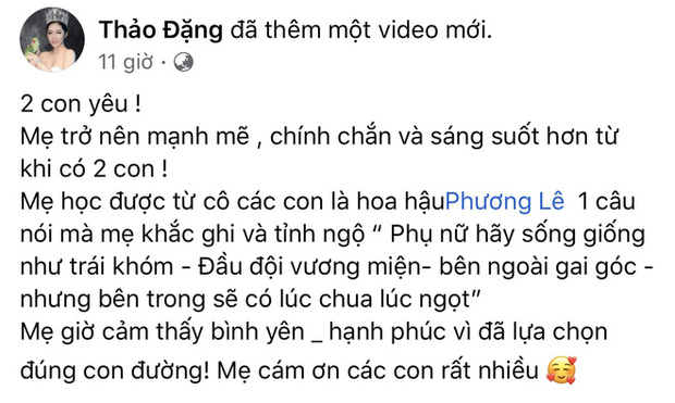 Đặng Thu Thảo nhận ra ở thời điểm hiện tại, các con chính là sức mạnh giúp bản thân vượt qua những biến cố trong cuộc sống. Cô bày tỏ: "Nhưng với những gì 3 mẹ con mình cố gắng! Sự đánh đổi này mẹ mong rằng đó là động lực lớn nhất và mạnh mẽ nhất để mẹ cố gắng thành công và mẹ sẽ cười thật hạnh phúc lúc đó nước mắt mẹ rơi là chỉ khi tay mẹ nắm tay 2 con bước vào trường quốc tế Anh ngữ bằng sự tự hào và hạnh phúc chứ không phải xa nhau như lúc này nữa! Cố lên các con nhé! Mẹ sẽ cố gắng nhanh nhất! Mẹ không phải người mẹ tốt nhưng sẽ là người mẹ dành những điều tốt nhất cho các con! Mẹ yêu và thương các con thật nhiều".