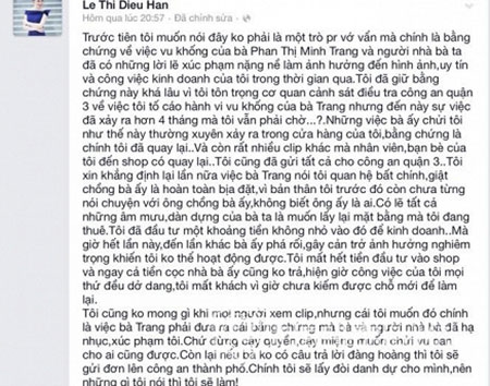 "Trước tiên tôi muốn nói đây ko phải là một trò PR vớ vẩn mà chính là bằng chứng về việc vu khống của bà Phan Thị Minh Trang và người nhà bà ta đã có những lời lẽ xúc phạm nặng nề làm ảnh hưởng đến hình ảnh, uy tín và công việc kinh doanh của tôi trong thời gian qua. Tôi đã giữ bằng chứng này khá lâu vì tôi tôn trọng cơ quan cảnh sát điều tra công an quận 3 về việc tôi tố cáo hành vi vu khống của bà Trang nhưng đến nay sự việc đã xảy ra hơn 4 tháng mà tôi vẫn phải chờ...?. Những việc bà ấy chửi tôi như thế này thường xuyên xảy ra trong cửa hàng của tôi, bằng chứng là chính tôi đã quay lại... Và còn rất nhiều clip khác mà nhân viên, bạn bè của tôi đến shop có quay lại. Tôi cũng đã gửi tất cả cho công an quận 3. Tôi xin khẳng định lại lần nữa việc bà Trang nói tôi quan hệ bất chính, giật chồng bà ấy là hoàn toàn bịa đặt, vì bản thân tôi trước đó còn chưa từng nói chuyện với ông chồng bà ấy, không biết ông ấy là ai. Có lẽ tất cả những âm mưu, dàn dựng của bà ta là muốn lấy lại mặt bằng mà tôi đang thuê. Tôi đã đầu tư một khoản tiền không nhỏ vào đó để kinh doanh. Mà giờ hết lần này đến lần khác bà ấy phá rối, gây cản trở ảnh hưởng nghiêm trọng khiến tôi không thể hoạt động được. Tôi mất hết tiền đầu tư vào shop và ngay cả tiền cọc nhà bà ấy cũng không trả, hiện giờ công việc của tôi mọi thứ đều dở dang, tôi mất khách vì giờ chưa kiếm được chỗ mới để làm lại.