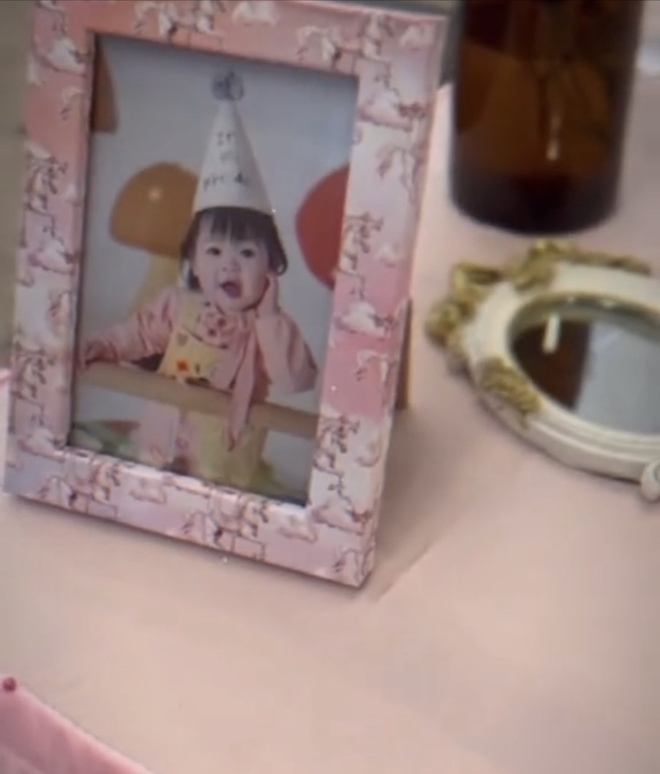 Con gái của Đỗ Mỹ Linh được mẹ cho diện chiếc đầm công chúa trắng tinh, trên tóc đính chiếc nơ xinh xắn. Chụp ảnh cùng bố mẹ, nhóc tỳ khiến nhiều người "lụi tim" với những biểu cảm cực đáng yêu, khi thì chu môi, lúc thì cười híp cả mắt. Có thể thấy ở thời điểm hiện tại, thiên thần nhỏ của Đỗ Mỹ Linh đã lớn phổng phao, gây sốt chính là đôi má bánh bao bầu bĩnh trông cực yêu. Đây là lần đầu tiên Đỗ Mỹ Linh tự tay chia sẻ hình ảnh cận dung mạo của con gái với công chúng nhân dịp nhóc tỳ được 1 tuổi.