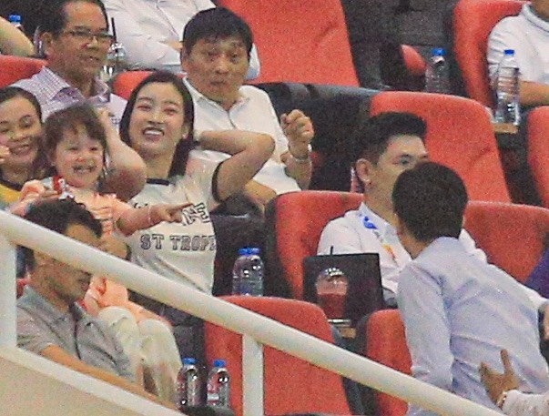 Vừa xem bóng đá, Đỗ Mỹ Linh vừa vui đùa cùng cháu gái đi cùng. Cô nở nụ cười tươi tắn khi nói chuyện cùng người nhà. Bên cạnh Mỹ Linh, Đỗ Vinh Quang lại vô cùng nghiêm túc, tập trung theo dõi các cầu thủ dưới sân thi đấu.