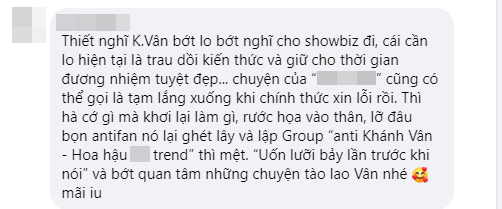 Trong khi đó, một số người nhẹ nhàng hơn thì cho rằng Khánh Vân không nên đưa ra quan điểm trong thời điểm nhạy cảm này vì bất kỳ người nào đứng về phía Hương Giang đều có thể "rước họa vào thân".