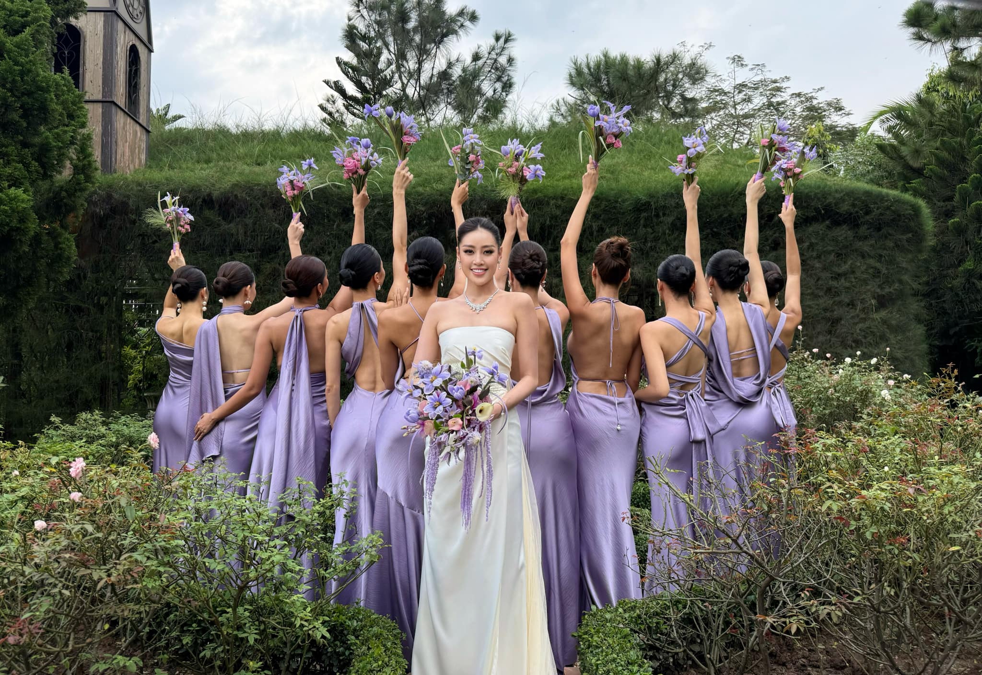 Thế nhưng, điều gây chú ý là cô không xuất hiện cùng chú rể hơn 17 tuổi mà lộ diện cùng dàn phù dâu cực xịn. Các cô dâu phụ được diện váy lụa màu tím, cắt xẻ khoe đường nét gợi cảm trên cơ thể. Dù chỉ là ảnh bóng lưng, nhưng nhìn qua cũng đã thấy đây chắc hẳn là dàn phù dâu gây "chấn động" Vbiz vào tháng 12 tới. Khánh Vân còn hào hứng thử thách cư dân mạng nhìn từ phía sau để đoán danh tính 10 mỹ nhân.