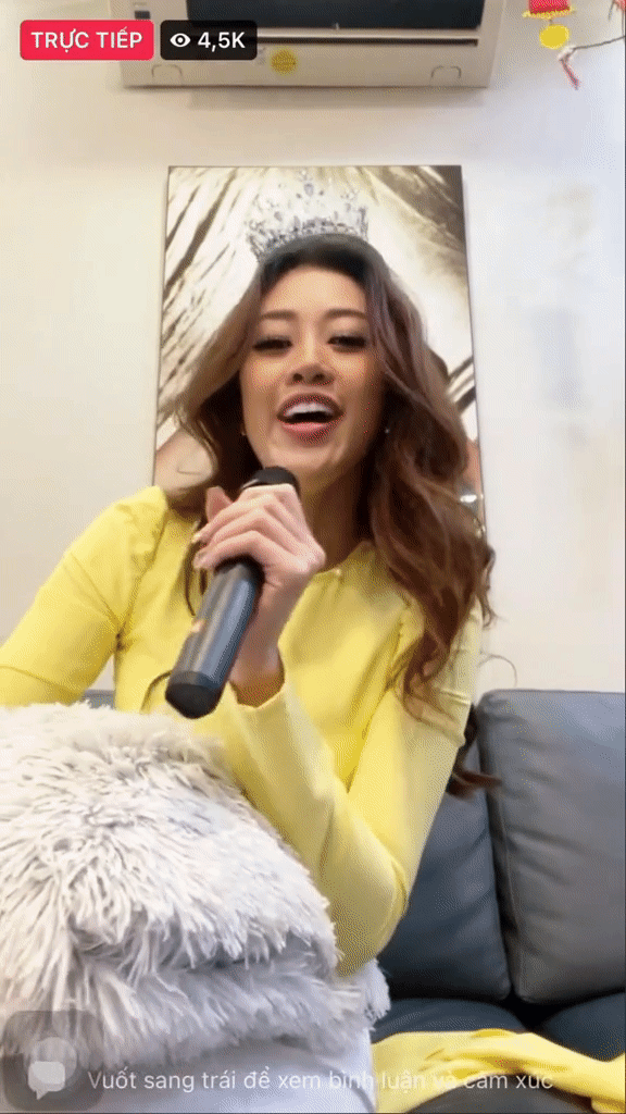 Theo đó, trong đoạn clip chính là hình ảnh Khánh Vân livestream giao lưu cùng khán giả trước thềm bước sang năm mới. Cụ thể, Khánh Vân diện cho mình bộ áo dài màu vàng đầy đằm thắm và dịu dàng, nàng Hậu đã ngẫu hứng hát hò giao lưu tặng cho khán giả bằng chiếc micro cầm trên tay và chiếc điện thoại và nhìn lời bài hát.