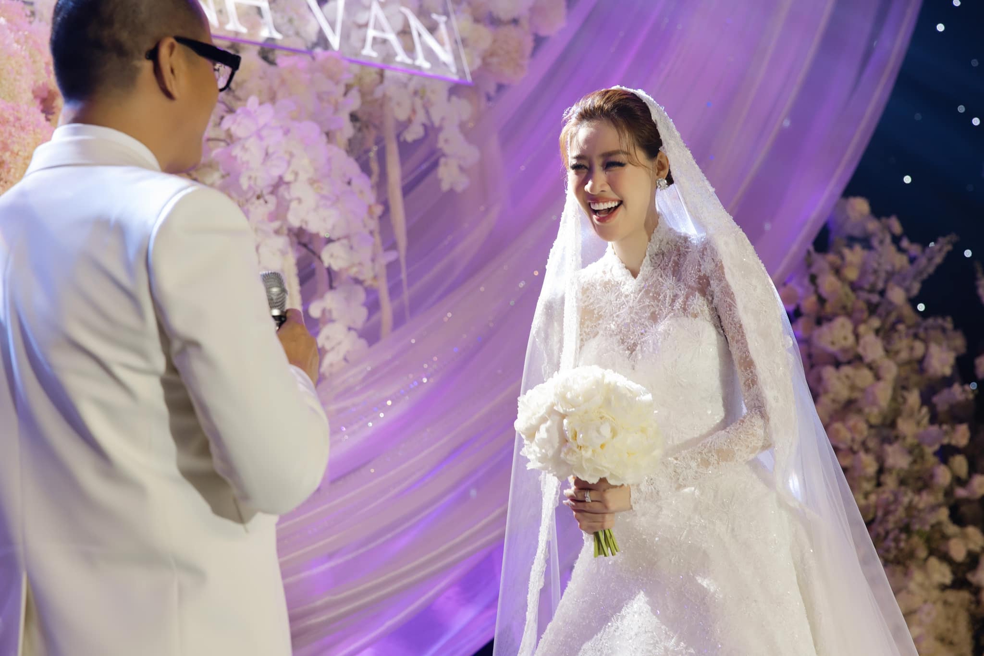 Khánh Vân khiến khách mời bật cười khi phát biểu hài hước: "Cảm ơn anh vì đã là một phần thanh xuân của em. Cảm ơn anh luôn yêu chiều, nhường nhịn và đồng hành cùng với em trong suốt hành trình. Cảm ơn anh đã chắp cánh những ước mơ của em, phụ với ba mẹ của em, đã lo cho em tất cả những điều em muốn. Có thể anh thường hay nói anh không phải là người hoàn hảo nhất, nhưng trong lòng em, trong trái tim của em anh là người chồng tuyệt vời và hoàn hảo nhất. Thường thì anh hay nói là em có thể hiền lại được hay không, bớt hung dữ lại được hay không. Nhưng mà ngày hôm nay thì có rất là nhiều người thân và bạn bè ở đây chứng kiến, thì xin lỗi anh em không làm được. Nhưng mà dù sao thì anh cũng là chồng của em rồi, ký giấy rồi chạy đâu cho thoát. Thành ra là mong chúng ta sẽ đi thật xa, thật xa và luôn luôn, mãi mãi bên nhau. Vợ yêu chồng nhiều lắm".