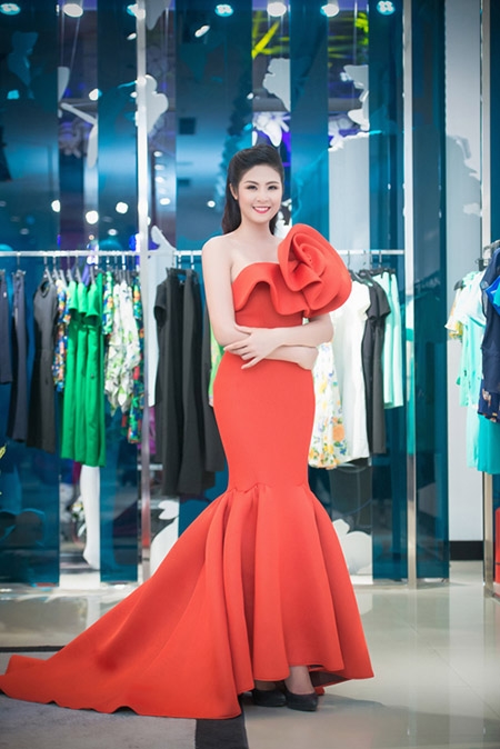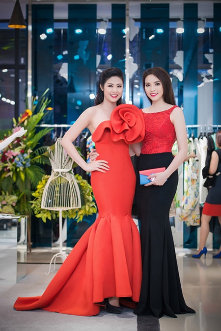 Hoa hậu Ngọc Hân cũng xuất hiện tại sự kiện tối qua trong bộ cánh đỏ lộng lẫy. |