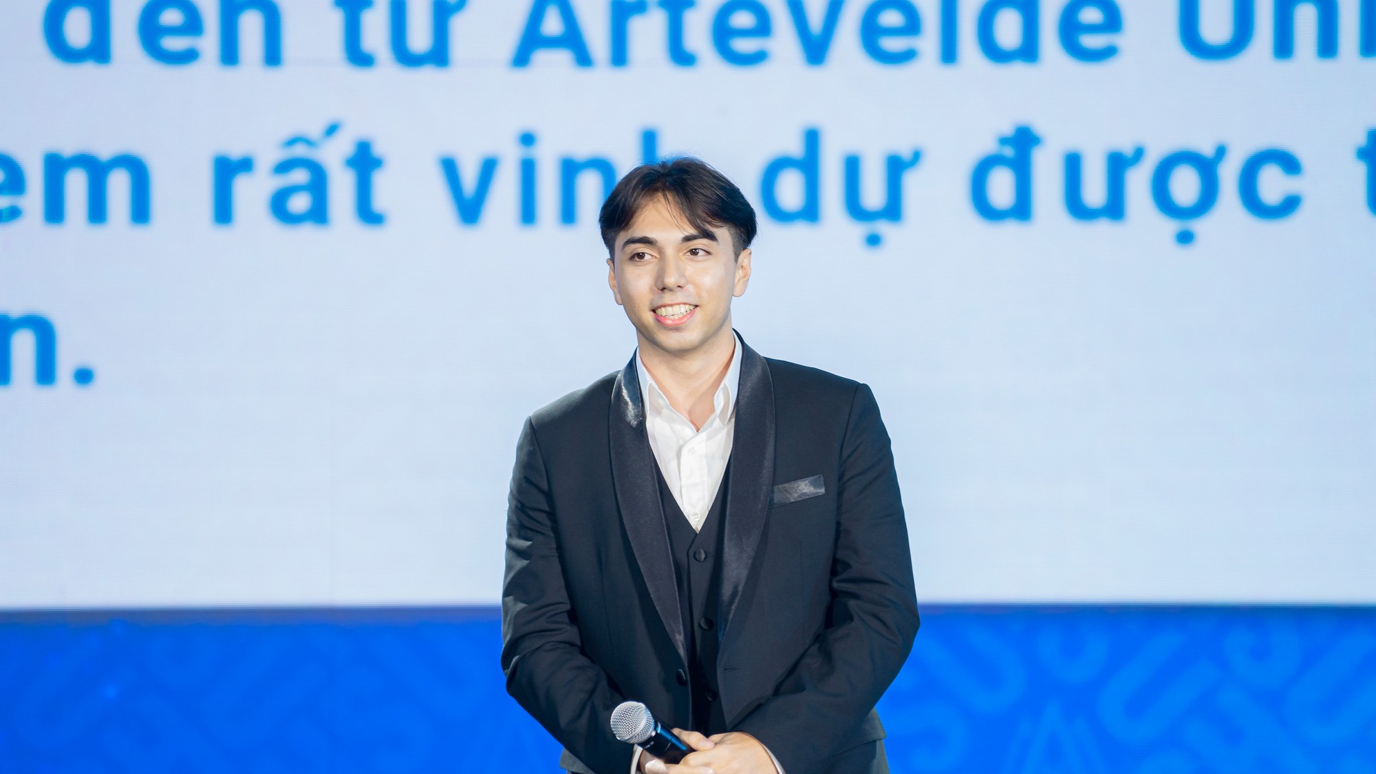 Bạn Trịnh Gia Phước - sinh viên Chương trình trao đổi quốc tế đại diện cho toàn thể các bạn khóa 24 phát biểu bằng tiếng Anh trong ngày khai trường. "Chuyến đi thực tế nước ngoài đã giúp mình trưởng thành hơn rất nhiều, tự tin và tự hào vào quyết định học tại trường".