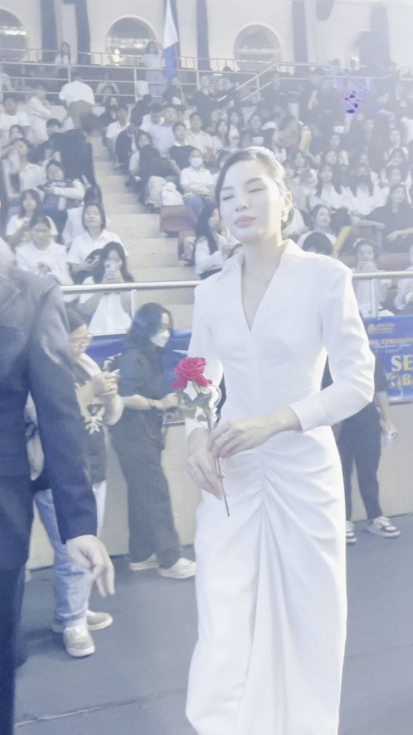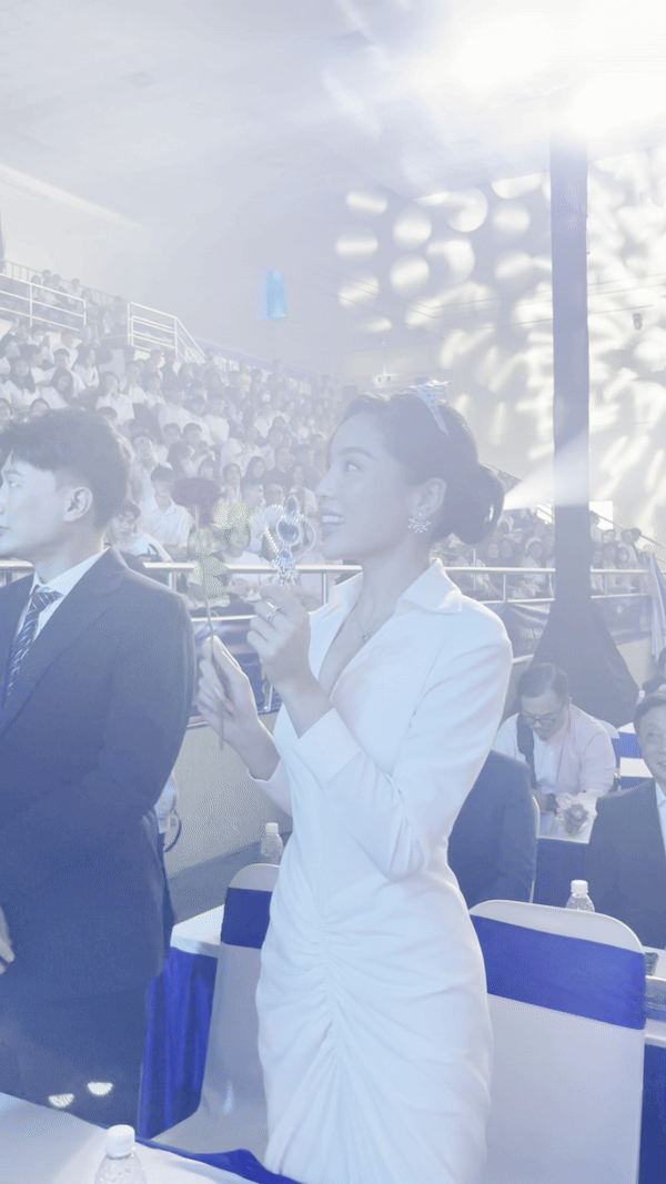 Xuất hiện tại lễ khai giảng, Hoa hậu Kỳ Duyên cũng ẩn ý các bạn sinh viên nên trân trọng việc học, đó là điều mà cô không "may mắn" làm được. Cô khựng lại một nhịp khi nhắc về việc học đại học của mình.