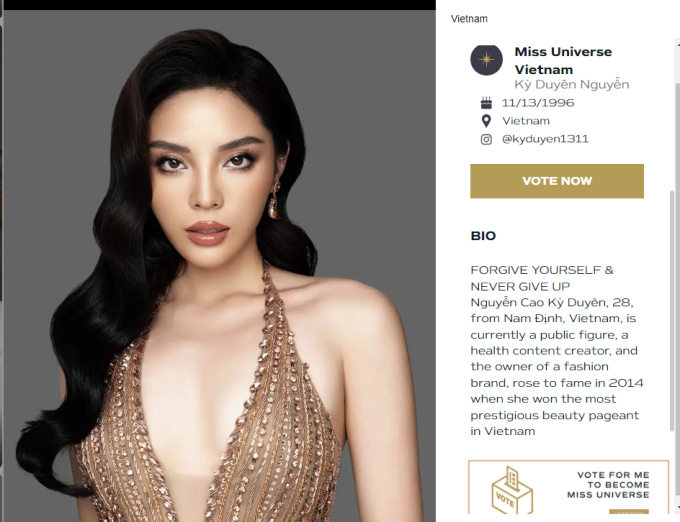 Ngoài việc thất vọng vì khoảnh khắc chào sân, cư dân mạng còn bàn tán về việc Kỳ Duyên đưa những thông tin để giới thiệu mình. Theo đó, đại diện Việt Nam chia sẻ: "Tha thứ cho bản thân và không bao giờ bỏ cuộc. Nguyễn Cao Kỳ Duyên, 28 tuổi, đến từ Nam Định, Việt Nam, hiện là người của công chúng, người sáng tạo nội dung về sức khỏe và là chủ sở hữu của một thương hiệu thời trang, nổi tiếng vào năm 2014 khi cô giành chiến thắng trong cuộc thi sắc đẹp danh giá nhất Việt Nam".