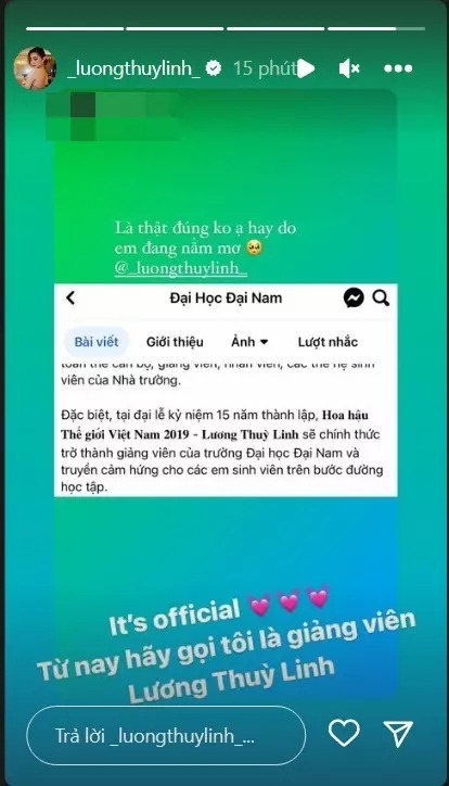 Chụp màn hình dòng thông báo: "Tại Đại lễ kỷ niệm 15 năm thành lập, Hoa hậu Thế giới Việt Nam 2019 - Lương Thùy Linh - sẽ chính thức trở thành giảng viên của trường Đại học Đại Nam và truyền cảm hứng cho các em sinh viên trên bước đường học tập", nàng hậu cũng xác nhận trở thành giảng viên ở tuổi 22.