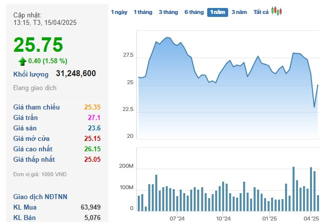 Tới đầu phiên chiều 15/4, HPG tiếp tục tăng lên mức 25.750 đồng/cp, đi ngược xu hướng điều chỉnh của thị trường chung khi VN-Index giảm hơn 15 điểm. Chỉ sau chưa đầy 1 tuần, thị giá HPG đã tăng hơn 19%.
