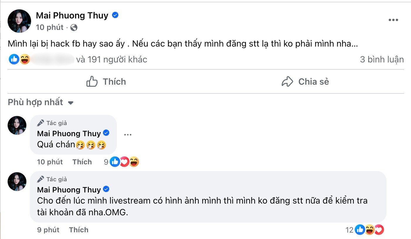 Người đẹp bày tỏ sự mệt mỏi trước tình trạng này, than phiền rằng bản thân cảm thấy quá chán nản. Cô cho biết sẽ tạm thời không chia sẻ thêm bất kỳ trạng thái nào cho đến khi có thể livestream trực tiếp và hoàn tất việc kiểm tra lại tài khoản.