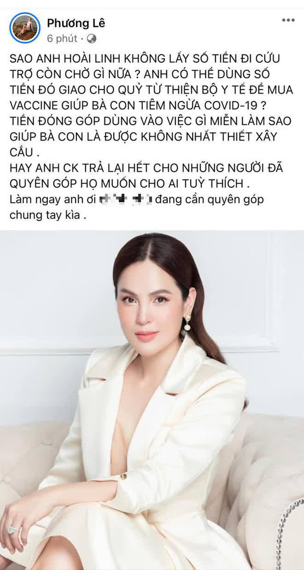 Tối ngày 25/5, trên trang Facebook cá nhân, Hoa hậu Quý bà Thế giới 2017 Phương Lê đã đăng tải một bài viết nói về hướng xử lý số tiền từ thiện còn đang nằm trong quỹ của NS Hoài Linh. Theo đó, người đẹp cho rằng Hoài Linh nên dùng số tiền này để đóng góp vào quỹ mua vaccine phòng Covid-19 thay vì cứu trợ miền Trung. Chưa hết, Phương Lê còn tiếp tục đưa ra một lời gợi ý khác khiến mọi người hết hồn hơn: "Hay anh chuyển khoản trả lại hết cho những người đã quyên góp họ muốn cho ai tuỳ thích. Làm ngay đi anh ơi".