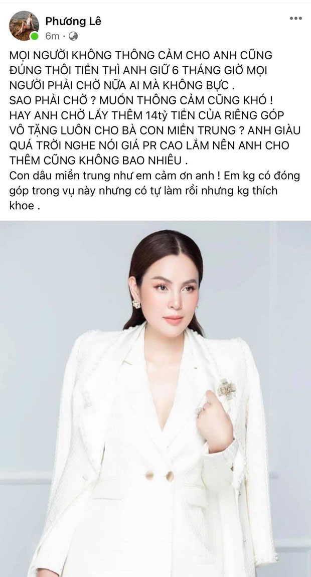 Trước làn sóng phản đối từ netizen, Hoa hậu Phương Lê vẫn không ngại mà đăng status mới để chỉ trích NS Hoài Linh. "Mọi người không thông cảm cho anh cũng đúng thôi, tiền thì anh giữ 6 tháng giờ mọi người phải chờ nữa ai mà không bực. Sao phải chờ? Muốn thông cảm cũng khó! Hay anh chờ lấy thêm 14 tỷ tiền của riêng góp vô tặng luôn cho bà con miền Trung? Anh giàu quá trời, nghe nói giá PR cáo lắm nên anh cho thêm cũng không bao nhiêu. Con dâu miền Trung như em cảm ơn anh. Em không có đóng góp trong vụ này nhưng có tự làm rồi mà không thích khoe", người đẹp viết.