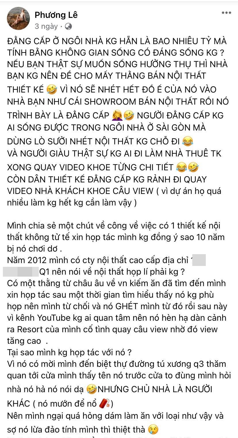 Mới đây, hoa hậu Quý bà Phương Lê đã đăng tải bài viết "bóc phốt" một NTK nội thất có tên tuổi ở Việt Nam, thu hút sự chú ý của đông đảo cư dân mạng.