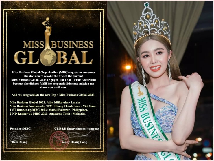 Cụ thể giữa tháng 7, người đẹp Nguyễn Thị Thảo đến từ Bình Định bị BTC Miss Business Global tước vương miện sau 4 tháng đăng quang vì không hoàn thành nhiệm vụ: "Quyết định thu hồi danh hiệu của tổ chức Miss Business Global cho đương nhiệm Hoa hậu Doanh nghiệp Toàn cầu 2023 (Nguyễn Thị Thảo - Đến từ Việt Nam).