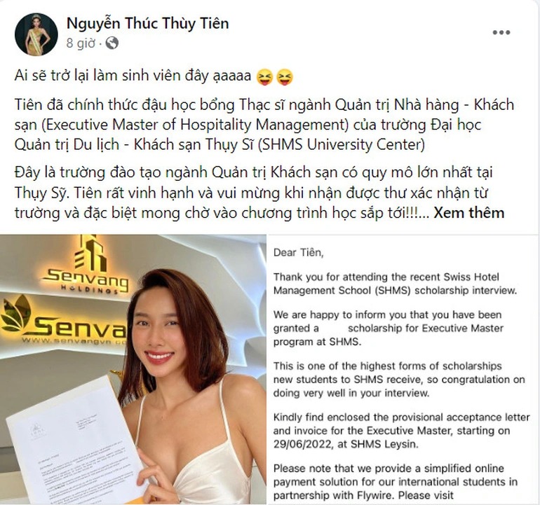 19/05/2022 17:15Hoa hậu Thùy Tiên nhận học bổng thạc sĩ của đại học top 4 thế giới tại Thụy Sĩ