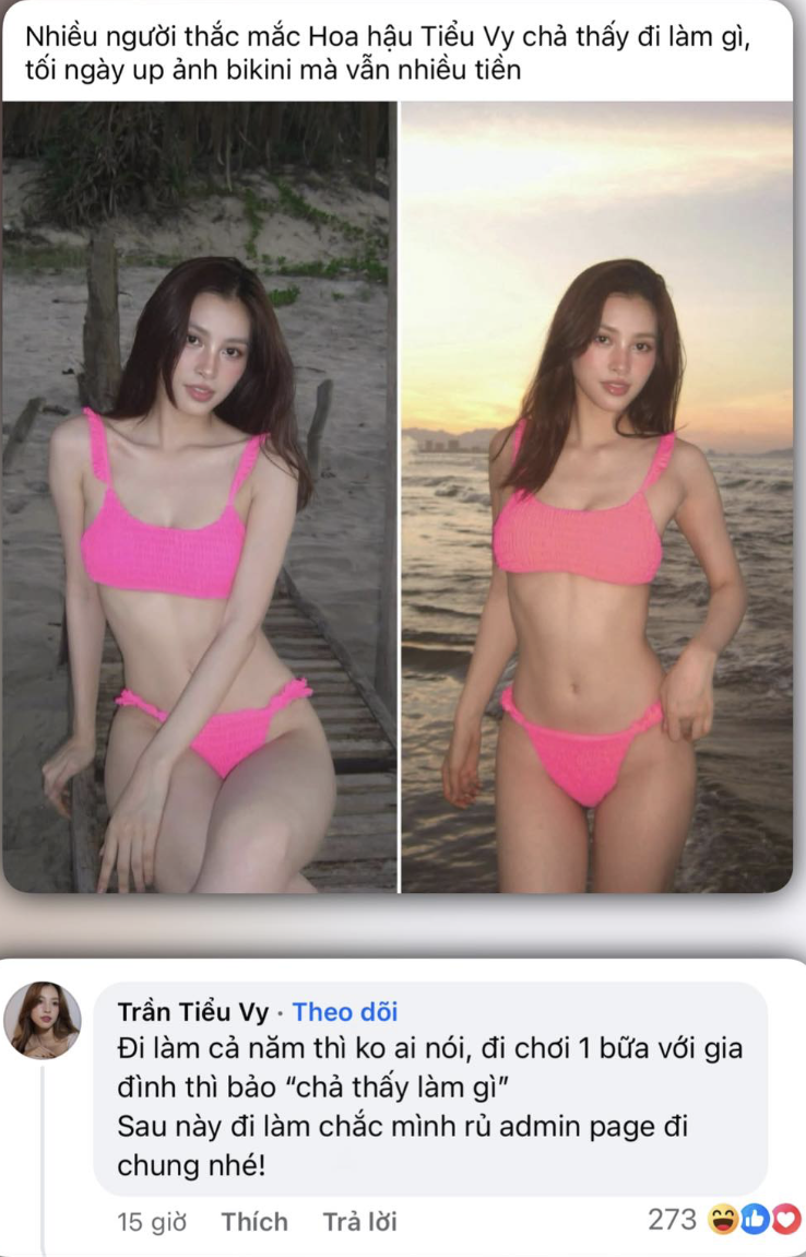 Bên dưới bài đăng này, Hoa hậu Tiểu Vy nhanh chóng đưa ra lời phản pháo: "Đi làm cả năm không ai nói, đi chơi một bữa với gia đình thì bảo chả thấy làm gì. Sau này mình đi làm chắc mình rủ admin page đi chung".