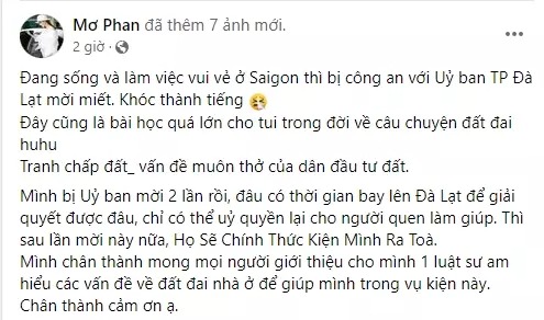 Đăng tải hình ảnh công văn từ cơ quan chức năng, Phan Thị Mơ khẩn thiết: "Đang sống và làm việc vui vẻ ở Sài Gòn thì bị công an với Ủy ban TP. Đà Lạt mời miết, khóc thành tiếng. Đây cũng là bài học quá lớn cho tôi trong đời về câu chuyện đất đai.