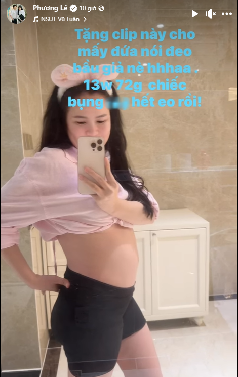 Cô chia sẻ hình ảnh lộ rõ vòng 2 lùm lùm và viết dòng chú thích đáp trả người nghi ngờ mình: "Tặng clip này cho mấy đứa nói đeo bầu giả nè. 13 tuần chiếc bụng hết eo rồi".