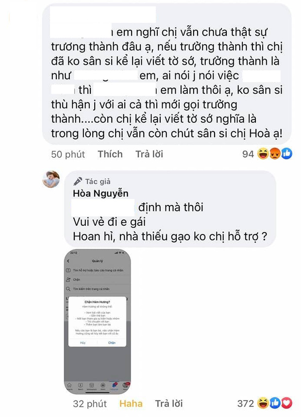 Đọc được bình luận này, Hoà Minzy liền có phản ứng gây chú ý. Theo đó, thay vì căng thẳng đáp trả, Hoà Minzy lại điềm tĩnh phản hồi bằng hình ảnh dự định "chặn" tài khoản này: "Định chặn mà thôi. Vui vẻ đi em gái, hoan hỉ. Nhà thiếu gạo không chị hỗ trợ?". Có thể hiểu ý của Hòa Minzy là thay vì lo chuyện bao đồng thì antifan ăn cơm nhà nên lo việc nhà mình trước tiên, còn nếu muốn lo việc của cô thì cô sẽ cho gạo.
