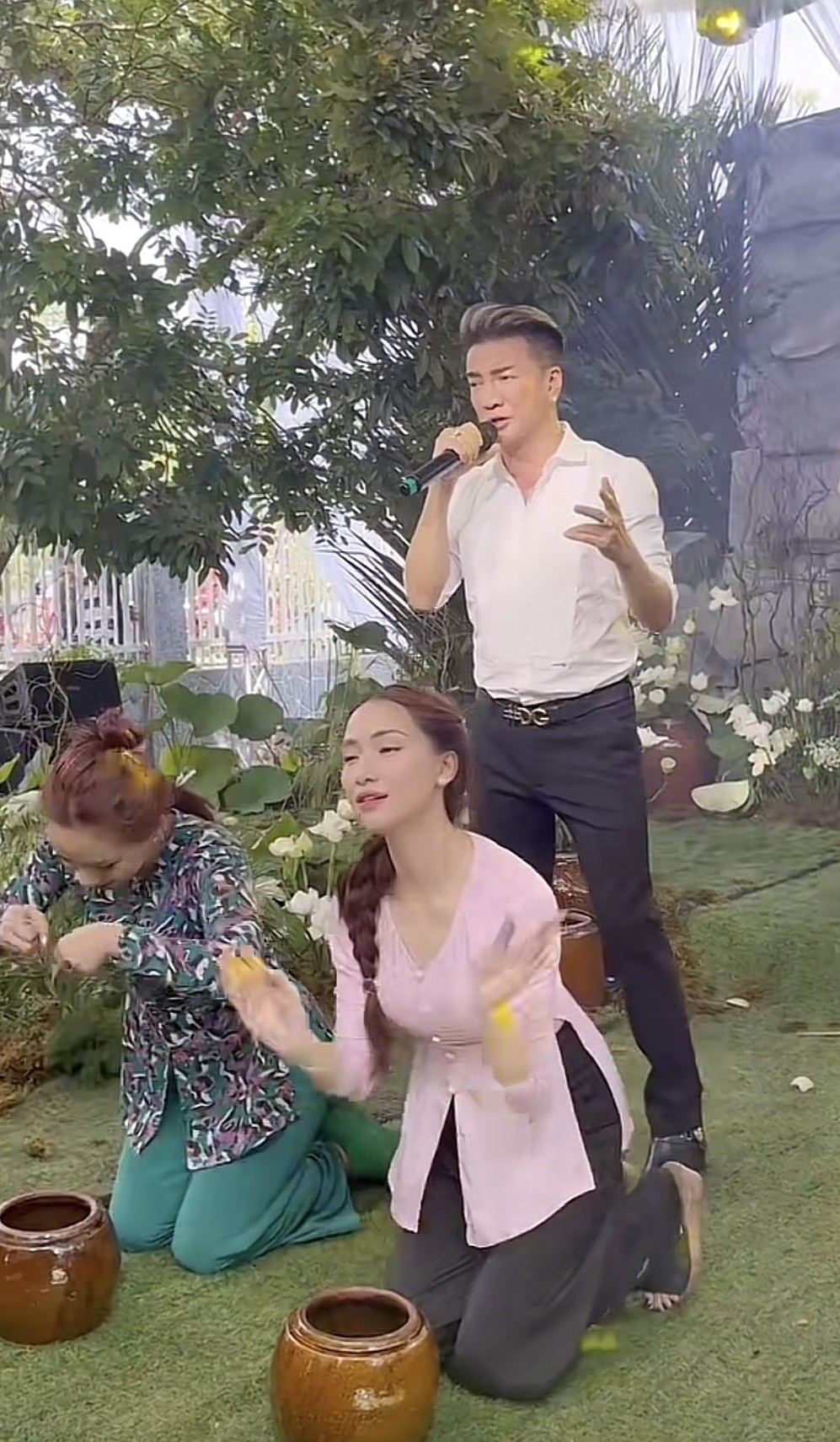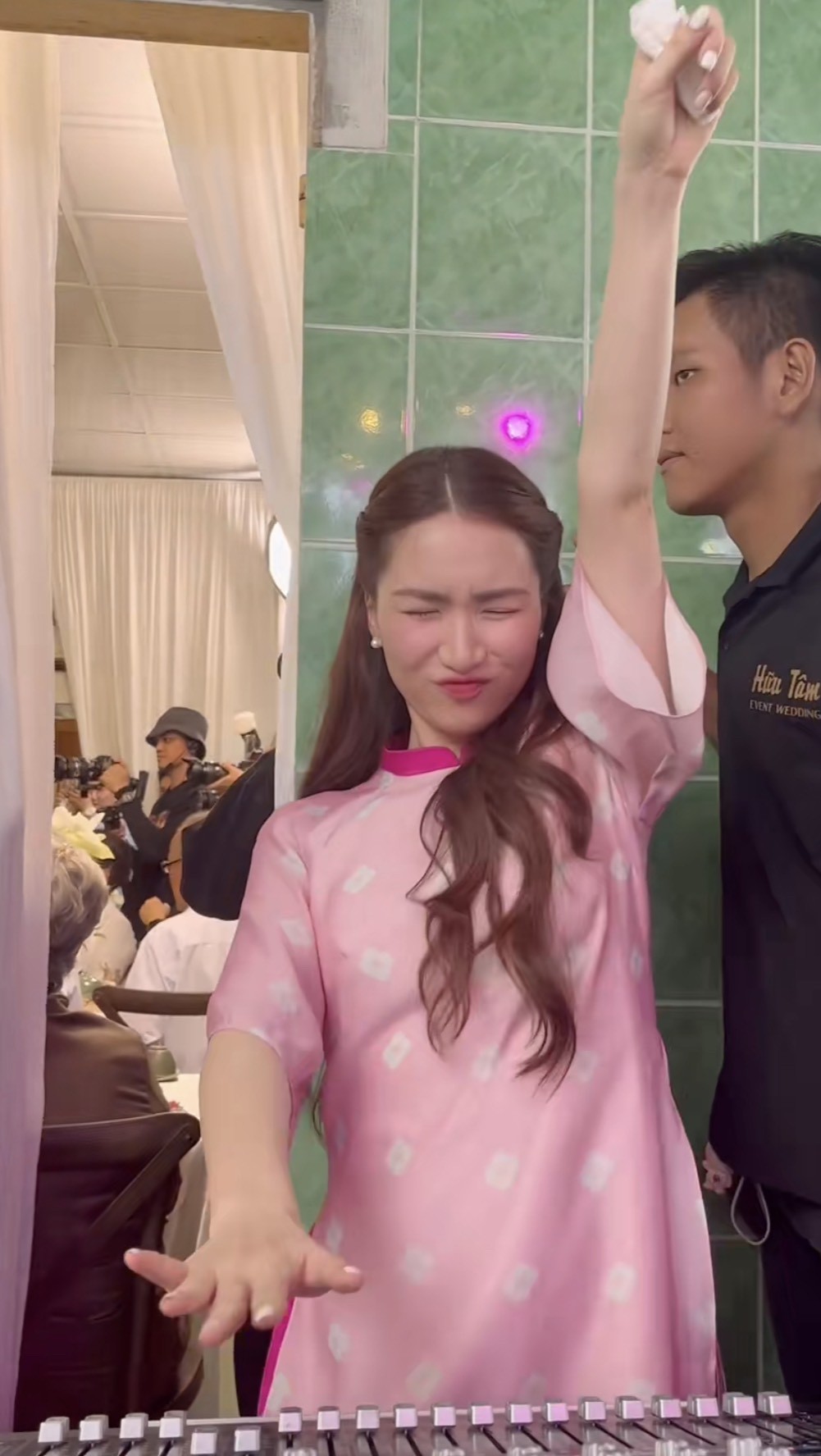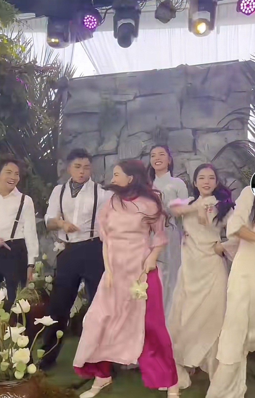 Sau đó, cô cũng xuất hiện với một chiếc áo bà ba hồng cánh sen dịu dàng không kém. Nhưng hình ảnh này của Hòa Minzy không giữ được lâu khi nữ ca sĩ bắt đầu nhập tiệc và có những tiếc mục "quẩy tưng bừng" trong đám cưới.