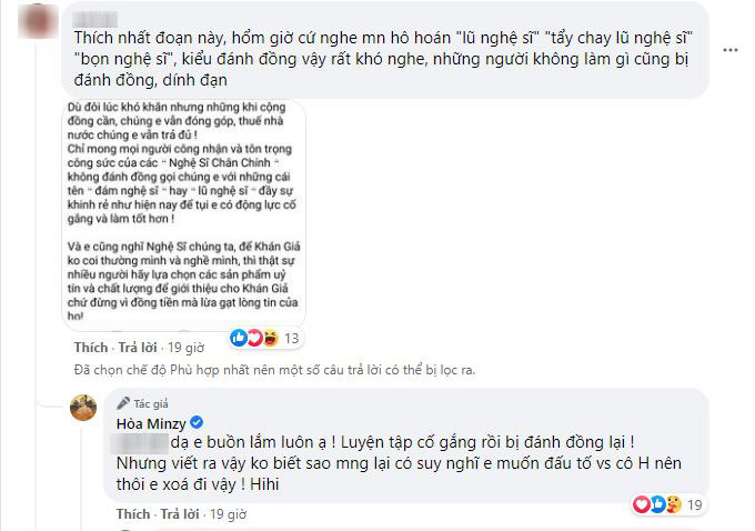Một số bình luận của khán giả về bài viết của Hòa Minzy: