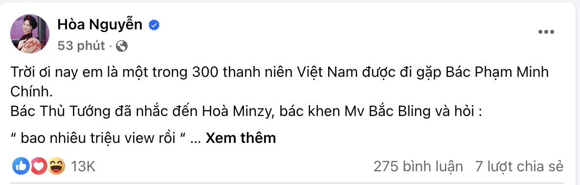 25/03/2025 04:37Hòa Minzy quá xịn: Được Thủ tướng Phạm Minh Chính khen ngợi, trang Thông tin Chính Phủ đăng bài đầy tự hào!