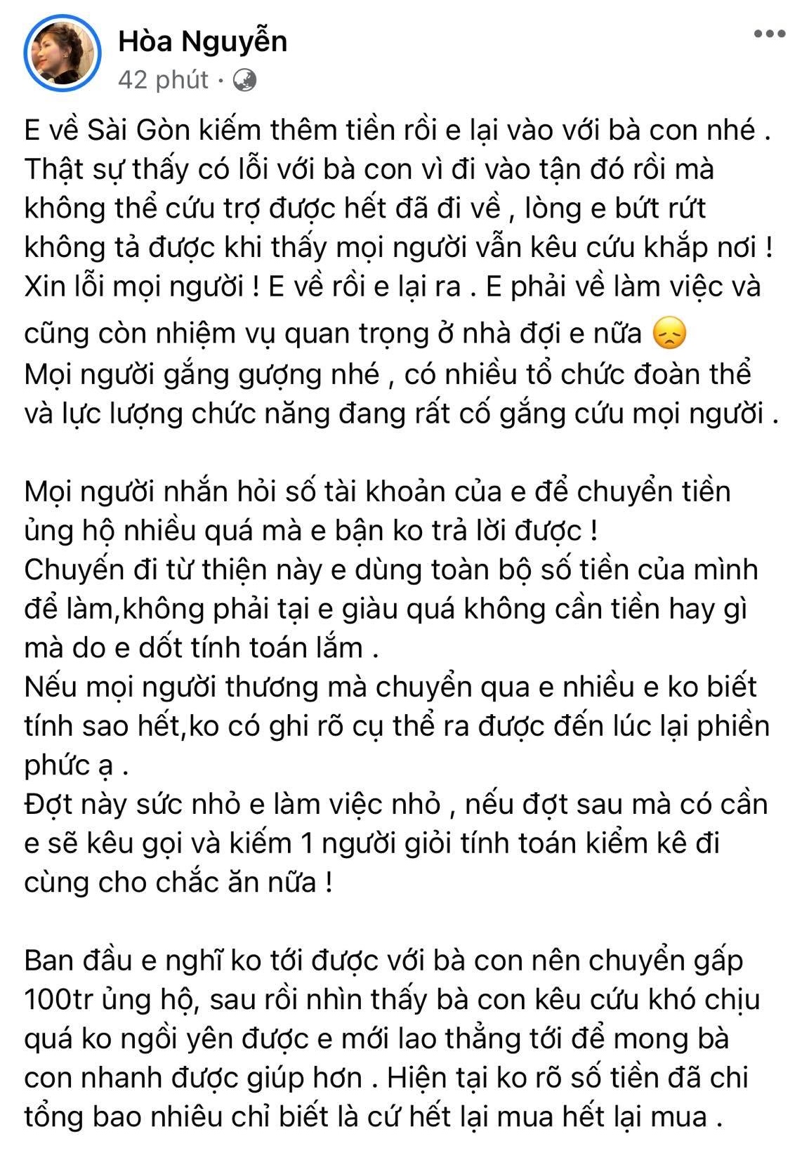 "Em về Sài Gòn kiếm thêm tiền rồi em lại vào với bà con nhé. Thật sự thấy có lỗi với bà con vì đi vào tận đó rồi mà không thể cứu trợ được hết đã đi về, lòng em bứt rứt không tả được khi thấy mọi người vẫn kêu cứu khắp nơi!