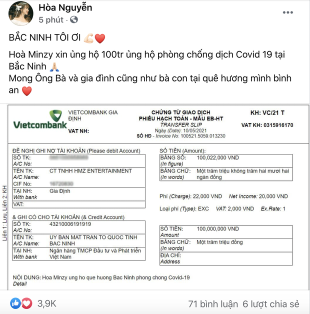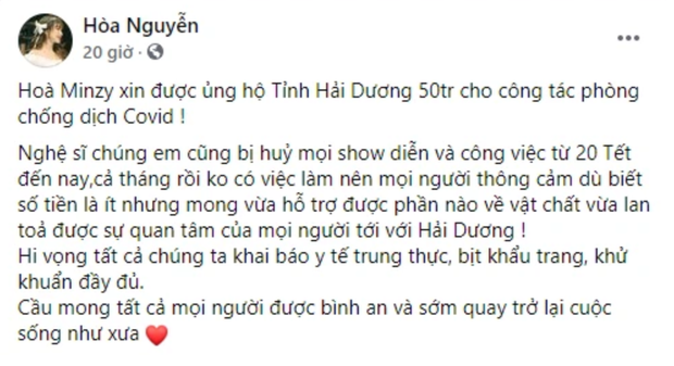 Mới đây, khi đọc tin về việc Bắc Ninh đã có nhiều ca nhiễm Covid-19, Hòa Minzy vô cùng lo lắng. Nữ ca sĩ Hòa Minzy đã quyết định ủng hộ Bắc Ninh 100 triệu đồng để phòng chống Covid-19. "Bắc Ninh tôi ơi. Hòa Minzy xin ủng hộ 100 triệu ủng hộ công tác phòng chống dịch Covid19 tại Bắc Ninh. Mong Ông Bà và gia đình cũng như bà con tại quê hương mình bình an", Hòa Minzy chia sẻ.