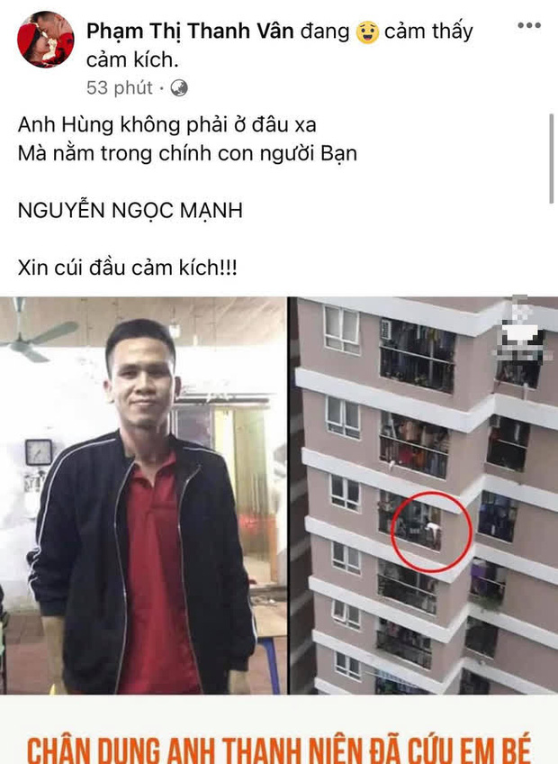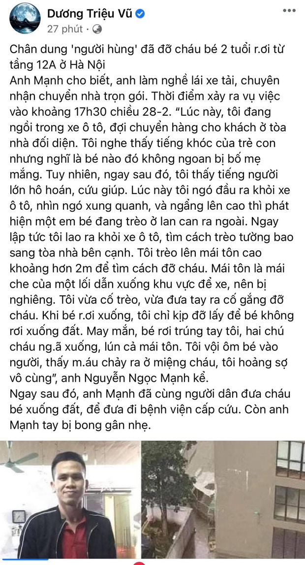 Từ tối ngày 29/2 đến sáng nay (ngày 1/3), trên các diễn đàn mạng xã hội đồng loạt chia sẻ câu chuyện bé gái 3 tuổi may mắn thoát chết khi rơi từ tầng 12 chung cư xuống. Nam thanh niên tên Nguyễn Ngọc Mạnh được xem như người hùng vì có hành động trèo lên mái che để ứng cứu kịp thời. Không chỉ người dân, dàn sao Vbiz cũng dậy sóng và đồng loạt gửi lời cảm ơn sâu sắc đối với Nguyễn Ngọc Mạnh.