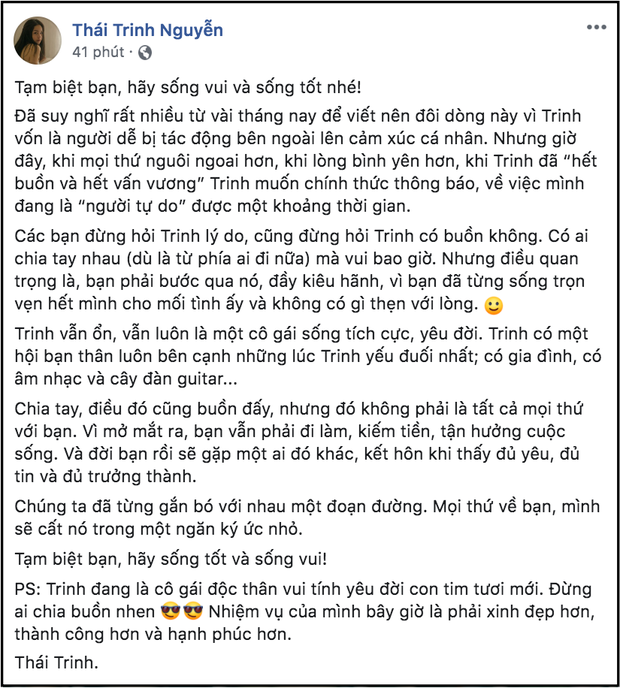 Tối 16/09, nữ ca sĩ Thái Trinh bất ngờ chia sẻ 1 dòng trạng thái dài trên Facebook, xác nhận đã kết thúc chuyện tình cảm với Quang Đăng. Thông tin này khiến không ít người bất ngờ, nhất là những ai đã dõi theo mối tình của cặp đôi này 2 năm về trước.