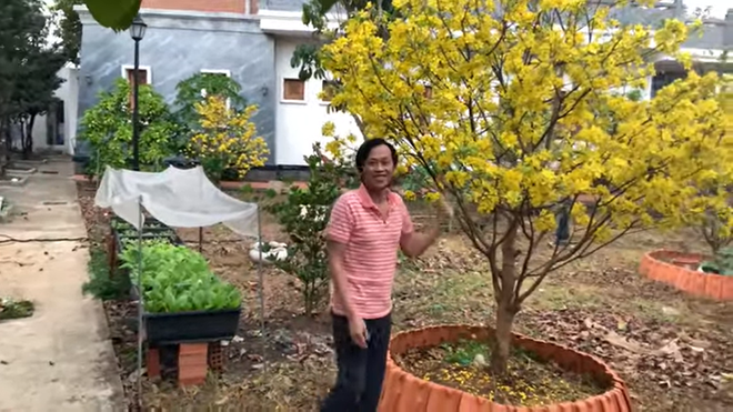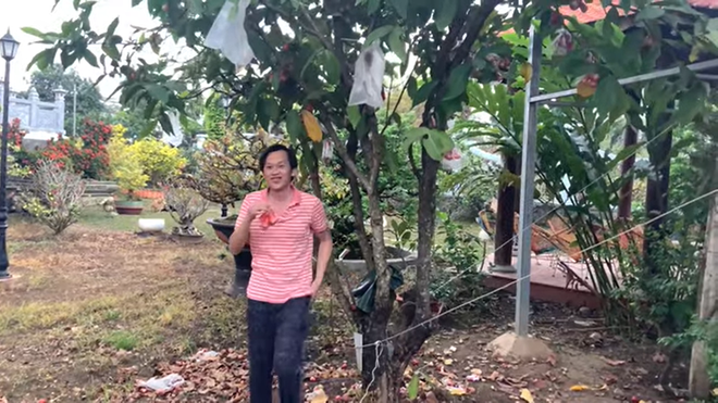 Khu vườn trong nhà thờ Tổ của Hoài Linh rất rộng và nhiều cây cối đơm hoa kết trái. Anh sung sướng khoe với khán giả những cây mai bề thế, nở rộ hoa trong vườn: