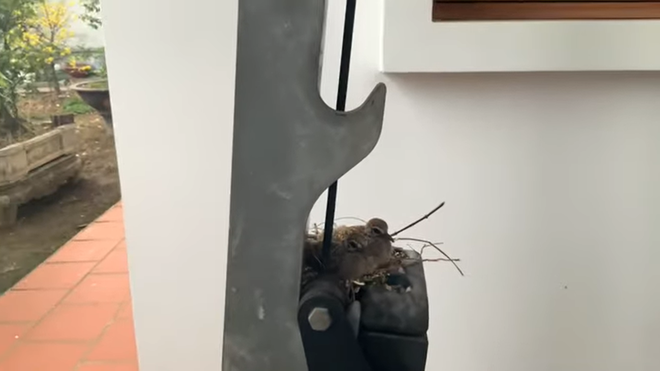 "Ôi trời ơi, tổ chim! Trời đất ơi, sao nó làm tổ nhanh dữ vậy? Từ lúc mua bộ tạ này về, tôi tập được 7, 8 ngày rồi ngưng được một thời gian mà chim làm tổ trên chỗ tập tạ luôn, ghê thật".