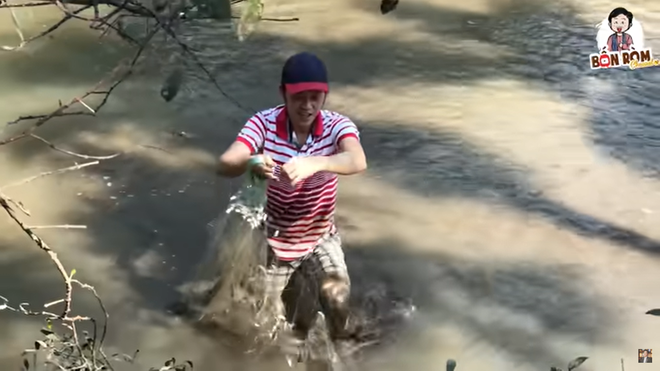 Dù là nghệ sĩ nổi tiếng, nhưng Hoài Linh vẫn không ngại bẩn, lội hẳn xuống lạch nước bùn đất để bắt cá. Anh phải lội nước ngập tận bụng, bị hụt chân mấy lần, phải thốt lên: "Nước vẫn còn sâu quá, chưa cạn hẳn nên tôi bị lún, hụt chân liên tục".