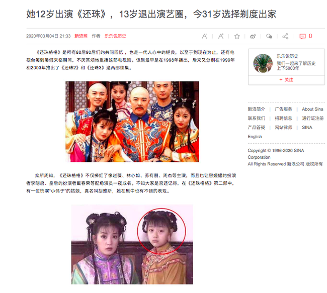 05/03/2020 14:34'Hoàn Châu Cách Cách': Tiểu mỹ nhân gắn với Triệu Vy 23 năm trước xinh đẹp mỹ miều nhưng gây sốc vì đi tu