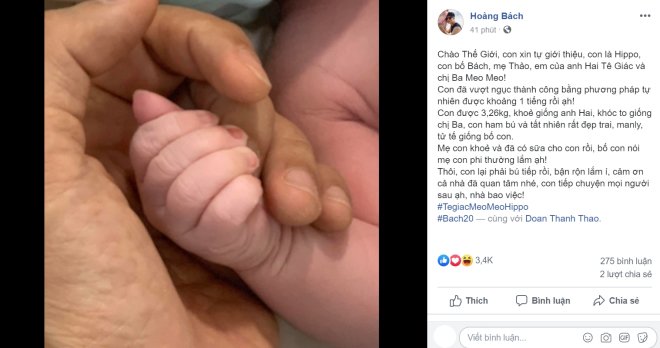 Hoàng Bách “thay mặt” con trai chia sẻ: “Chào thế giới, con xin tự giới thiệu con là Hippo, con bố Bách, mẹ Thảo, em của anh Hai Tê Giác và chị Ba Meo Meo. Con đã 'vượt ngục' thành công bằng phương pháp tự nhiên được khoảng 1 tiếng rồi ạ. Con được 3,26kg, khoẻ giống anh Hai, khóc to giống chị Ba, con ham bú và tất nhiên rất đẹp trai, manly, tử tế giống bố con.